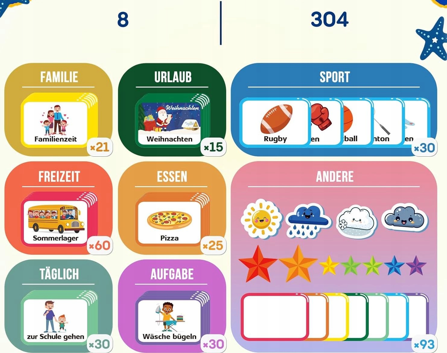 - 304 магніти у восьми категоріях: наші магніти поділено на вісім категорій – вільний час, хобі, завдання, план харчування, повсякденне життя, сім’я, фестиваль, погода та зірки та порожній; ширше охоплення, більша кількість, краща якість
