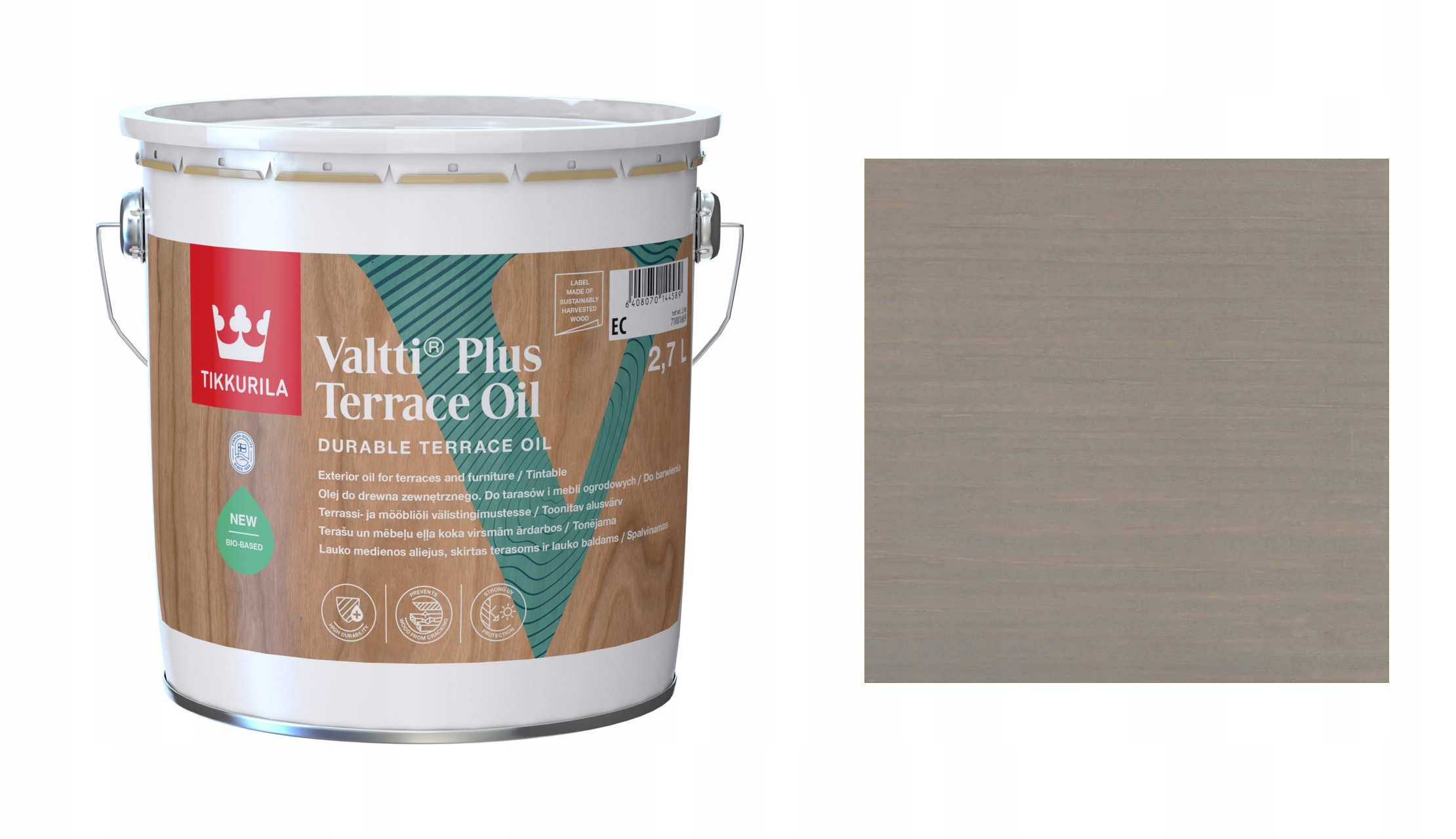 Масло для зовнішніх дерев’яних поверхонь. Він захищає деревину від УФ і створює дуже міцну поверхню. Для Tikkurila valtti плюс терасовою олією 75% від загального вмісту органічного вуглецю було замінено компонентами рослинного походження (позначене відповідно до ASTM D6866-18), що становить 18% по відношенню до загального складу продукту.
