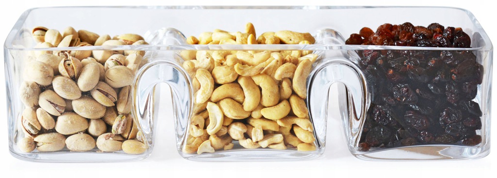 Велика міцна скляна салатниця з трьох частин 30x11x7 см, ідеально підходить для подачі печива, горіхів, закусок тощо.
