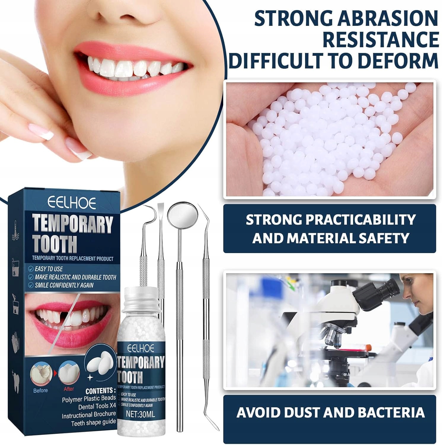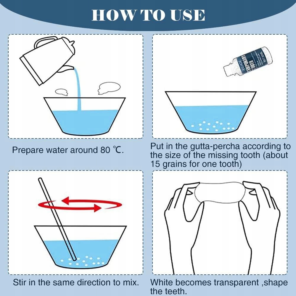 кульки, виготовлені з високоякісного походження матеріалу смоли. Кульки в гарячій воді (80-100 градусів Цельсія), щоб вони стали пластиковими і дали їм утворюватися. Це дозволить вам тимчасово заповнити відсутні зуби. Коли матеріал теплий, він практично безбарвний, тому ми можемо зробити бажану форму кращою та точнішою. Білий колір повернеться після того, як матеріал охолоне вниз, або після затоплення холодною водою