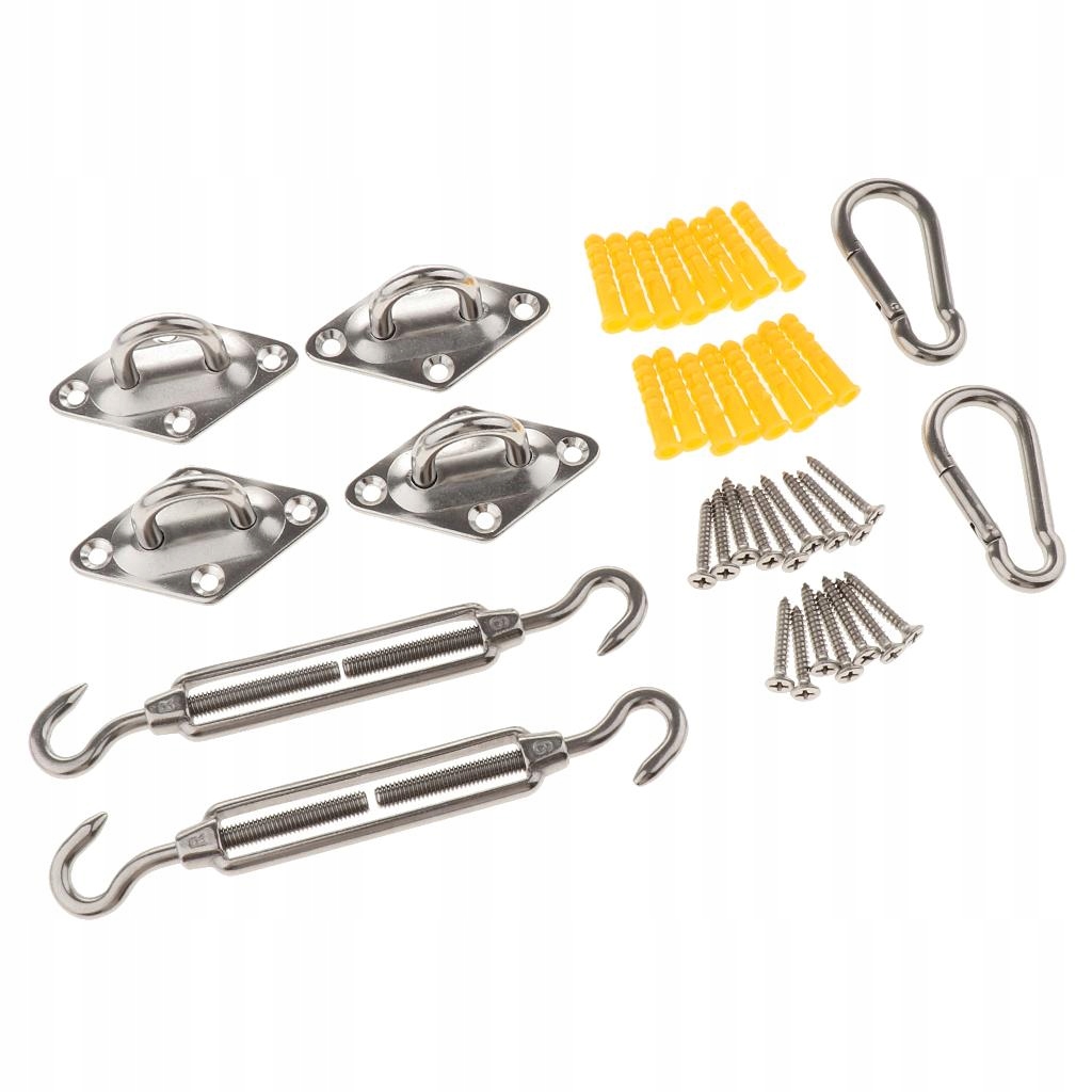 Набір містить 2 натяжні гвинти, 4 прокладки, 2 карабіни/гачки, 16 гвинтів, 16 вологих гвинтів