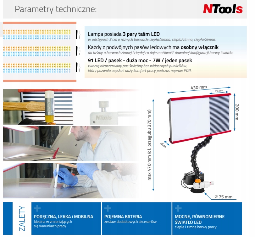 - 91 світлодіод/ремінь - висока потужність - 7 Вт/один ремінь складається з безперебійного світла без видимих точок, що дозволяє отримати багато комфорту під час ремонту PDR