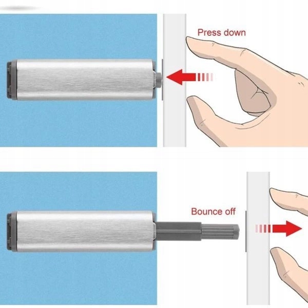 Бампер Tip-On довжиною 80 мм дозволяє відкривати двері без установки ручки. Push to Open легко відкривається легким натисканням. Бампер із магнітним наконечником використовується в передніх частинах без ручок.