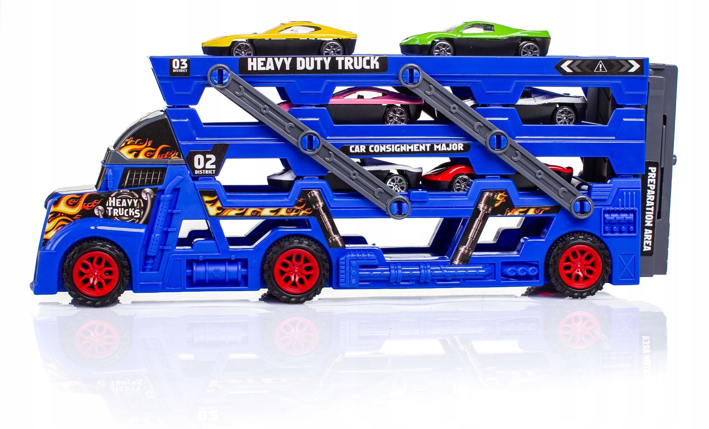 Причіп має 3 рівнідля перевезення іграшкових машинок. Також він оснащений автомобільною пусковою установкою.