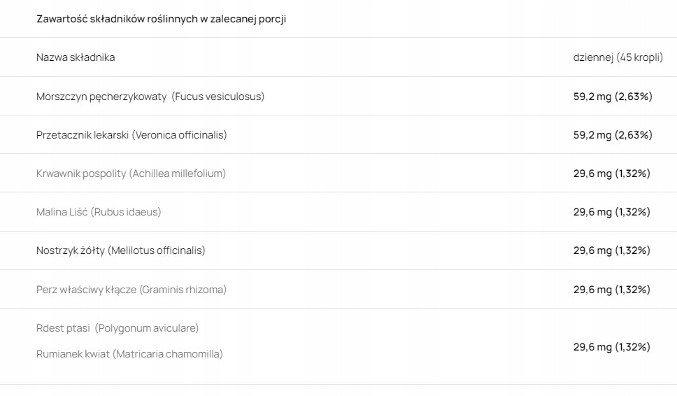 4 Ризома), ptasi (полігонум aviculare), ромашка квітка (Matricaria comomilla), харчовий гліцерин (E422), пропіленгліколь (E1520), яблукову кислоту (E296), цитрат натрію (E 331), Vitamin C (E330), Vitamin E (D-ALPOFOFININ) (E 307).Попередження: