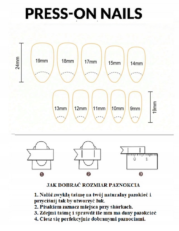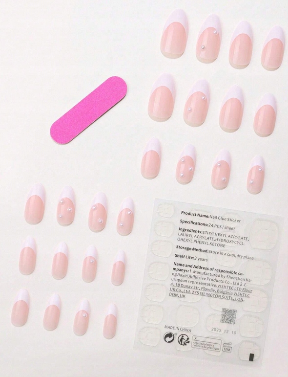 У упаковці ви знайдете 24 цвяхи в 12 розмірах, наклейка (подвійна стрічка, щоб приклеїти нігтя) та міні -файл