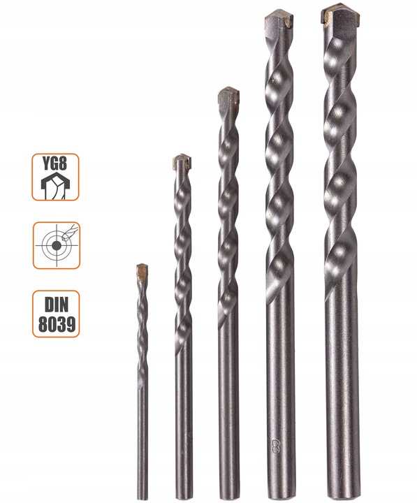 - Свердла Widia по бетону з циліндричною ручкою та двома ріжучими кромками. Ріжучий наконечник виготовлено з карбіду вольфраму (widia) YG8, що забезпечує тривалий термін служби та повторюваність отворів.