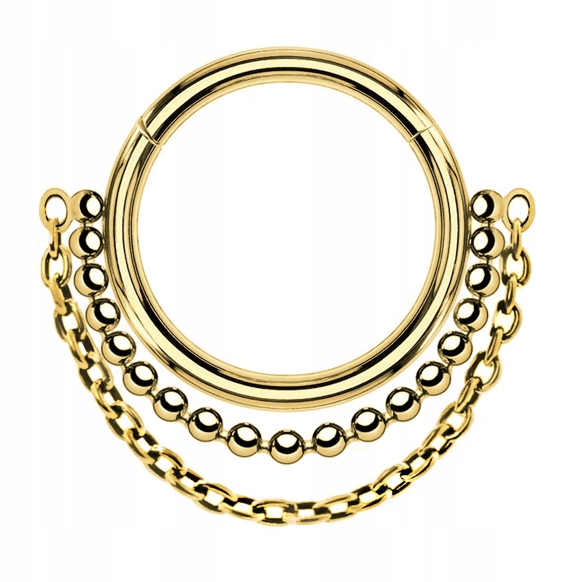 Коло титану з декоративним ланцюгом. Це унікальне пронизливе коло відрізняється делікатним ланцюгом, який тонко рухається з кожним рухом, додаючи прикраси виняткової динаміки та легкість. Ретельно виготовлений з titanium g23 , це коло поєднує довговічність з витонченістю, а прикраси у вигляді невеликих кульок і ланцюга створюють гармонійну композицію, яка привертає увагу. Ви можете носити їх у вушній пелюстці або перегородки , якщо вам подобаються виразні та оригінальні прикраси.