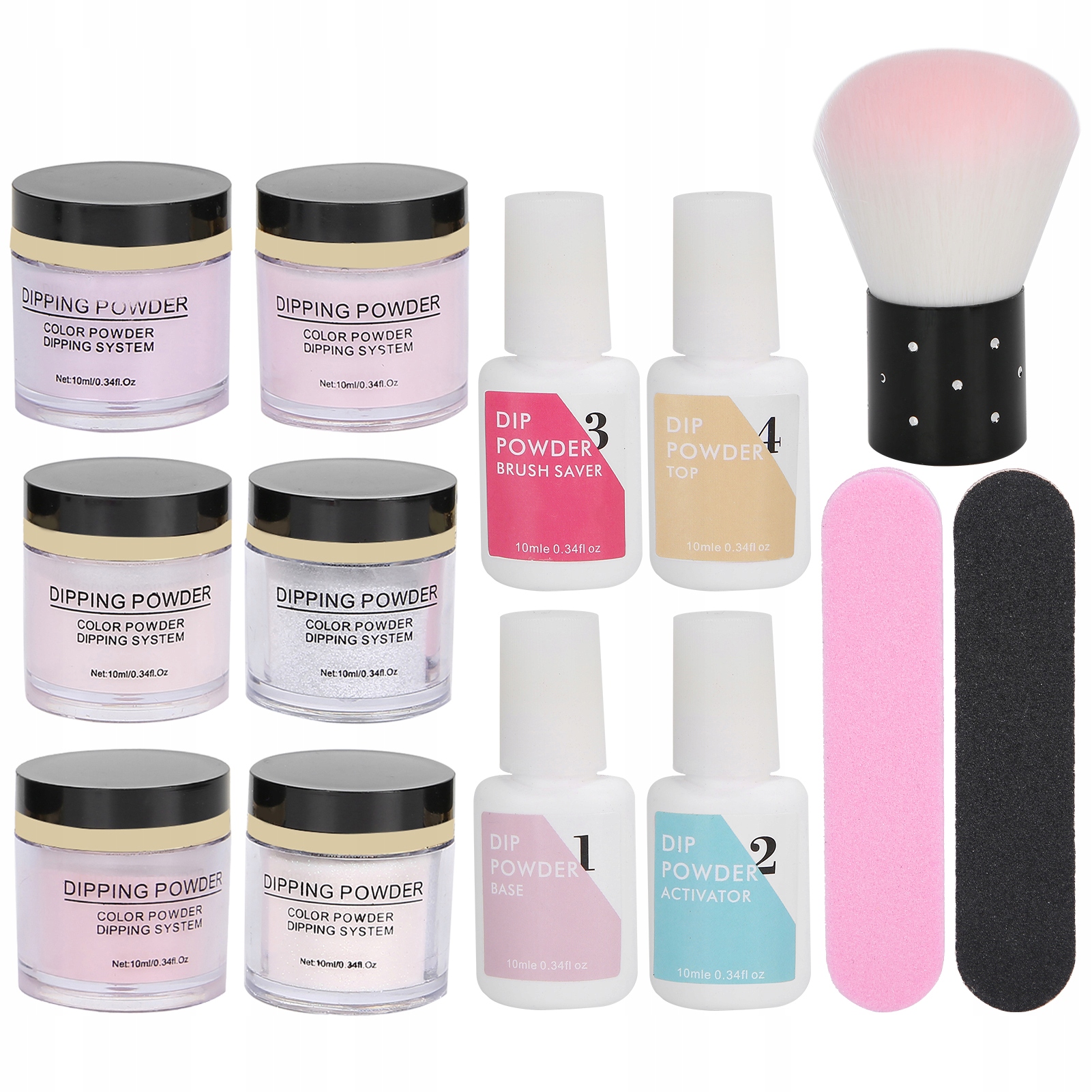 1. Набір порошків для нігтів, включаючи 6 кольорів порошку для нігтів, а також не для промивання верхнього покриття, фундаменту, сушіння, рідини для чищення щіток, аксесуарів для пилки тощо, цілий набір, що дає кращий досвід нігтів.