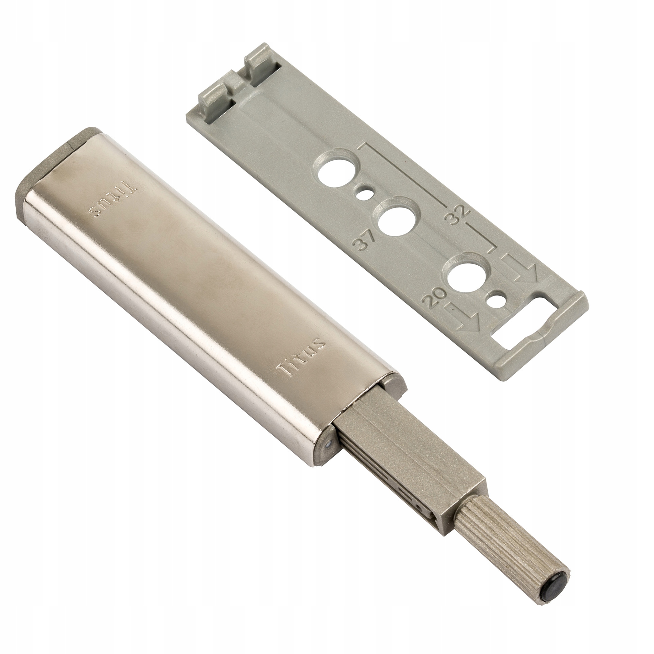 Бампер PUSH LATCH TITUS використовується для стандартного відкривання дверей і ящиків без ручок. Адаптована для роботи зі стандартними петлями та напрямними, гарантує ефективність системи. Виготовлений з високоміцних матеріалів, він забезпечить тривалу роботу і стійкість до механічних пошкоджень. Бампер PUSH LATCH TITUS характеризується великою міцністю, тому він може легко відштовхнути навіть важку передню частину або ящик. Завдяки сталевому покриттю елемент виглядає дуже естетично і неодмінно впишеться в будь-які меблі. Проста монтажна пластина дозволить швидко та легко збирати та розбирати елемент.