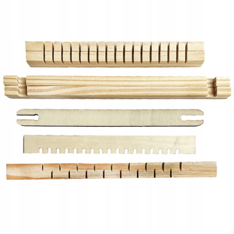 - Елементи Drewyne для складання прямокутного ткацького верстата, насоси (для перетягування пряжі) - 1 ПК, гребінець (для натискання тканих фрагментів килима) - 1 елемент, дерев'яний елемент для підняття струни заміни 4 4 4