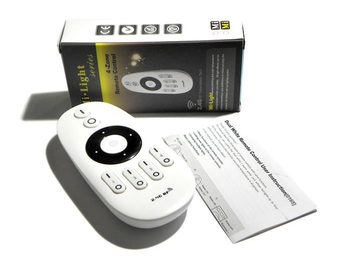 Пульт дистанційного керування, що працює з приймачем, дозволяє вмикати та вимикати освітлення, регулювати яскравість і температуру білого, а також вибирати одну з чотирьох робочих зон. При використанні одноколірних стрічок до приймача можна підключити дві незалежні установки. Радіо пульт дистанційного керування, що працює на високій частоті 2,4G, забезпечує низьке енергоспоживання, великий діапазон дії (30 м), високу стійкість до перешкод і високу швидкість роботи. Пульт дистанційного керування може керувати чотирма незалежними робочими зонами, наприклад, підсвічуванням телевізора, підвісною стелею, люстрою тощо. Кожна зона може складатися з одного або кількох приймачів, які керують окремими установками.