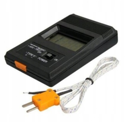 Цифровий вимірювач температури з дисплеєм і термопарою типу К. Призначений для точкового вимірювання в діапазоні від -50 до 1300°C . Він може вимірювати температуру з роздільністю 1°C. Він живиться від батареї 6F22 9 В, батарея входить в комплект.