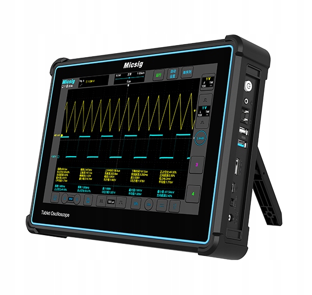 Портативний осцилоскоп із серії MICSIG - це цифровий осцилоскоп з 10,1 -дюймом РК -дисплея та сенсорним екраном. Пристрій має два канали і характеризується хорошими параметрами вимірювання: діапазон 200 МГц, швидкість вибірки 1 GSA/S та буфер пам'яті 110 МПТ. Він має численні виходи для підключення до іншого пристрою через USB 3.0 та 2.0, USB Type C, HDMI та Wi -Fi. Крім того, осцилоскоп оснащений роз'ємом живлення та акумулятором 7500 мАг, що дозволяє працювати до 5 годин на один заряд. У корпусі також є підставка, яка дозволяє розмістити осцилограф під кутом 45 ° зручним способом роботи.