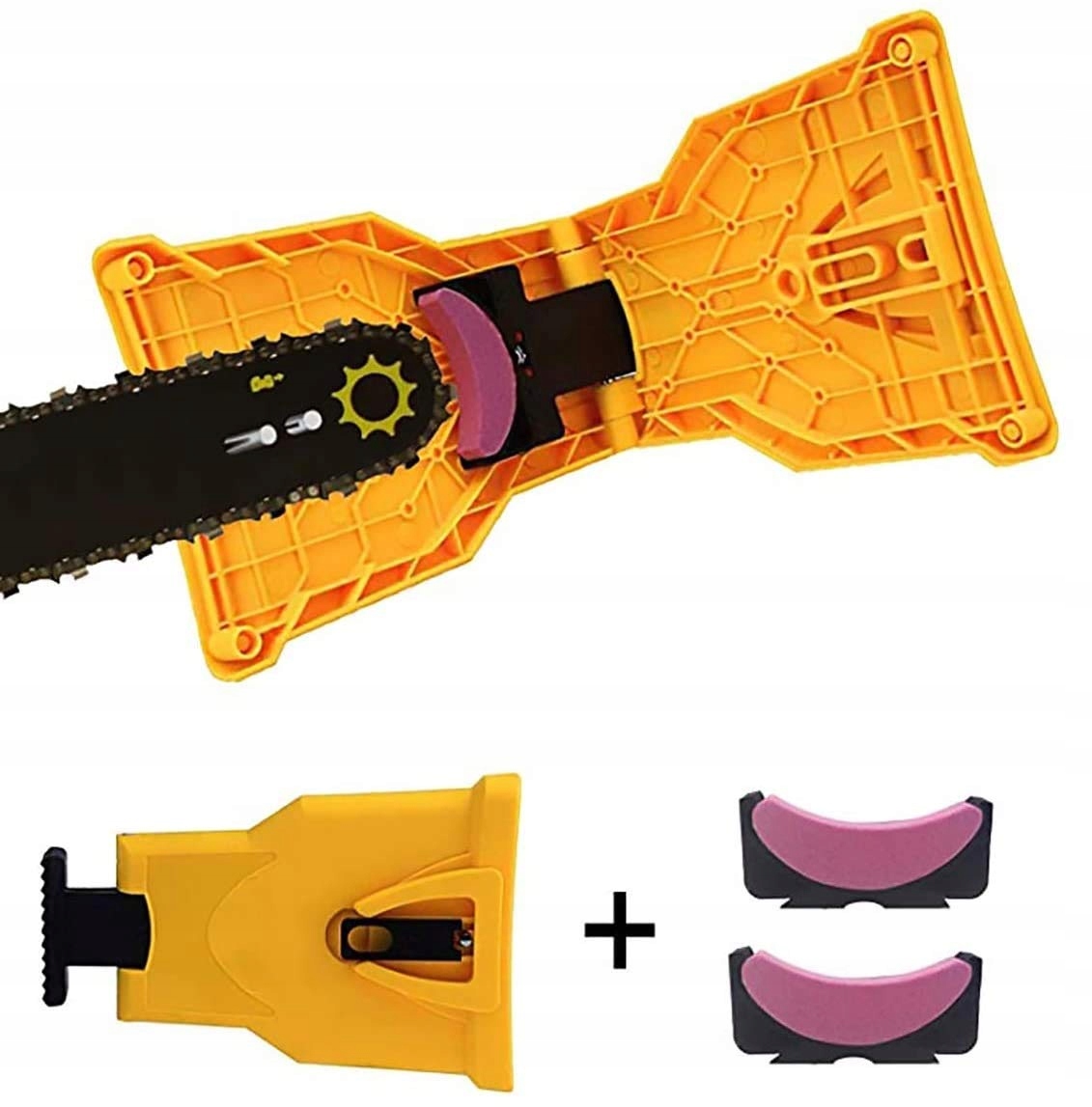 Пристрій для заточування бензопил із двома точильними каменями.