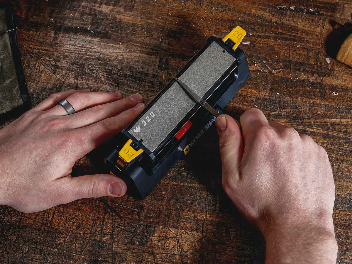 Точильна машина Work Sharp Benchstone оснащена кутовими напрямними (встановленими на магніті)під кутом нахилу 20° та 25°. Після розміщення головки ножа на напрямній все, що вам потрібно зробити, це рівномірно перетягнути лезо по заточувальній пластині під постійним кутом.