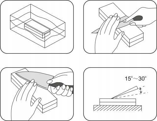 - Підготовка каменю:Камінь Naniwa Chocera Pro #1000 є моделлю Splash & Go - не потребує тривалого замочування. Просто збризніть або змочіть його поверхню водою безпосередньо перед початком заточування.