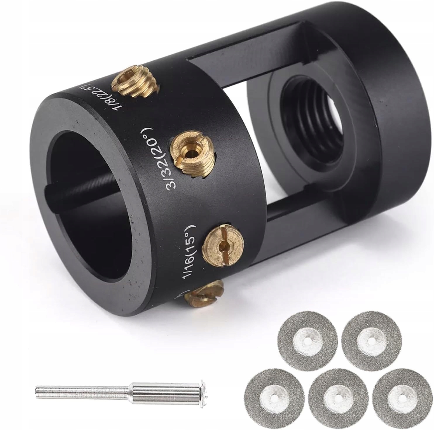 головка шліфувальної машини дуже легка і зручна, вона важить лише 87 г. Всі отвори нерухомі, тому ви можете встановити компенсацію зсуву для кожного розміру отвору, щоб забезпечити центр наконечника вольфраму в середній точці шліфування. Ця компенсація гарантує, що лінії на кінчику вольфрамового електрода максимально прості. Якщо розташування отвору є змінним, ви не можете встановити компенсацію зсуву.