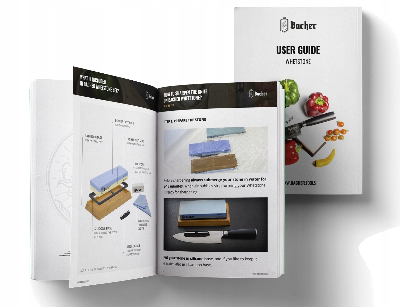 Точила для каменів Bacher призначена для заточування всіх типів кухонних ножів, вуличних ножів, кишенькових ножів, мачете та багатьох інших. Широка абразивна поверхня каменю забезпечує правильну адаптацію до будь-якого розміру леза. Аксесуари, що входять до комплекту точила, забезпечують легке, точне та безпечне заточування.