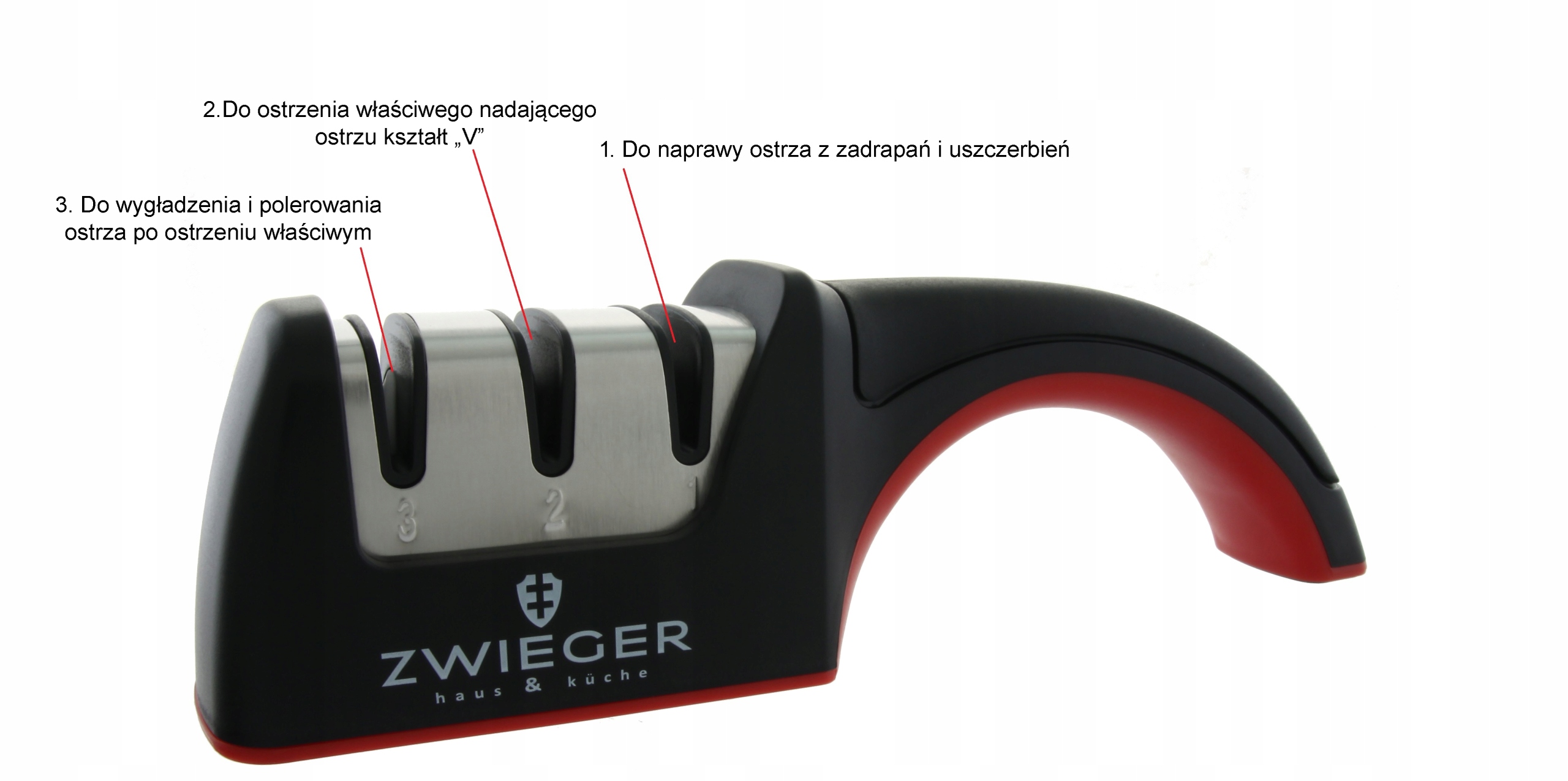 залежно від ступеня концентрації ножа, використовуйте три-два прорізи для заточення. Ножі повністю тупий у поле №1, потім №2, і, нарешті, згладжують краї у поле № 3. У випадку ножів, лезо, вам потрібно лише оновити, ми використовуємо слот №2 і гладко в поле № 3. Кожного разу, у кожному з слотів, ми перетягуємо лезо вперед і назад, м'яко натискаючи на ручку.