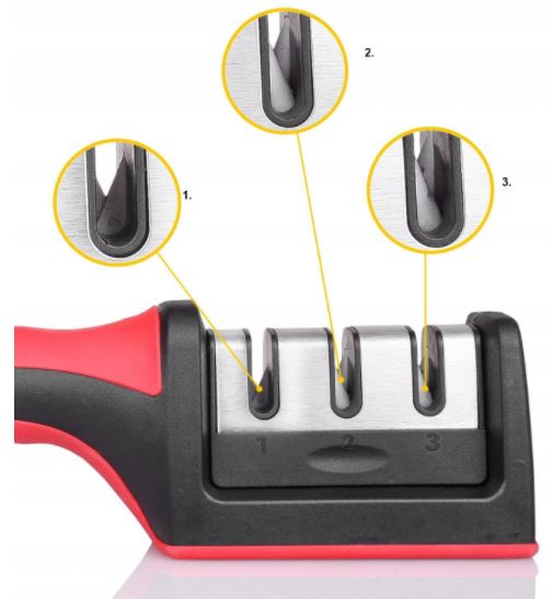 Ручна точилка для ножів має 3 гнізда з різними функціями заточування. Кожен з них має V-подібну форму, що підвищує ефективність даного засобу. За допомогою триступеневої точилки для ножів ви зможете легко заточити навіть найтупіші ножі- навіть ті, якими занедбали або не використовували багато років. Заточування ножів ручною точилкою для ножів відбувається в три етапи. Кожен з них однаково важливий, тому їх не варто пропускати. Перший етап передбачає попереднє заточування ножа. На наступному етапі лезо точно згладжується, щоб нарешті бути дуже ретельно відшліфованим.