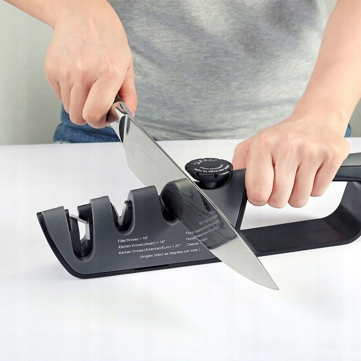 Регулювання за допомогою ручки дозволяє заточувати під дуже широким діапазоном кутів, починаючи від 14 градусів до 24 градусів з кожного боку. Спеціально розроблений шліфувальний ролик загострить ножиці та ножі з одним лезом.