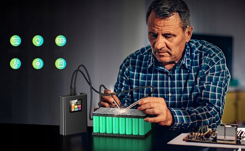- На відміну від більшості зварювальних зварювань, доступних на ринку, наше міні-паяльне залізо підтримує товщину 0,1-0,15 мм. Ця машина невелика, але повністю функціональна, яка може задовольнити різні потреби, пов'язані з виробництвом батарей. (Примітка: після отримання першої зарядки та вправи багато разів, щоб знайти правильну пайку.)