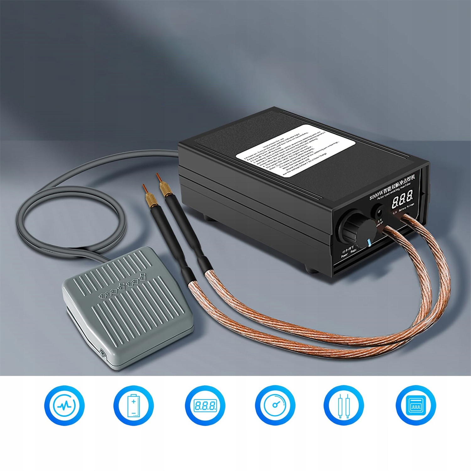 【Легка експлуатація Забезпечена акумуляторна зварювальна машина використовує перемикач для управління для управління зварюванням, що дозволяє більше зварювати точки. Просто натисніть ремінь нікелю двома паяльними шпильками і натисніть перемикач ноги. Зачекайте приблизно 0,5 секунди для виходу зварювання точки, а потім відпустіть перемикач ноги. Підходить для точного зварювання.