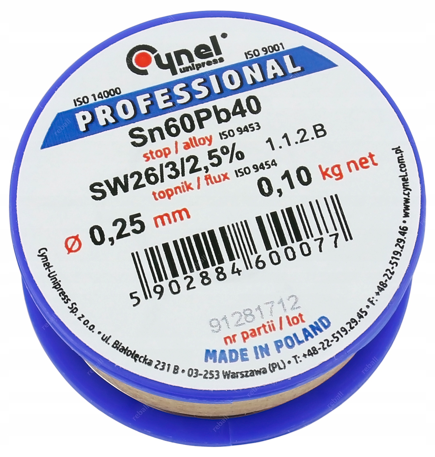 Свинцевий сплав S-Sn60Pb40, вироблений під час першої плавки олова та свинцю відповідно до стандарту PN EN 29453:2000, у процесі безперервного лиття без доступу повітря, потім екструдований, що забезпечує усунення оксидів. p>