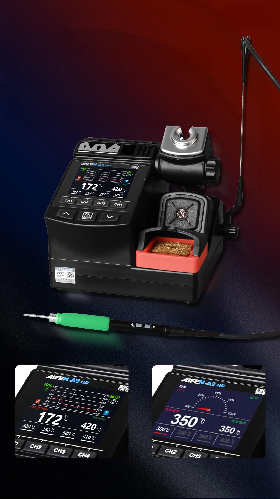 AIFEN A9 HD -дайка - це рішення для тих, хто зосереджується на точності, надійності та комфорті використання. Завдяки розширеному дисплея та сучасному користувальницькому інтерфейсу, управління температурою стає більш інтуїтивно зрозумілим, ніж будь -коли раніше. Корозійна стійкість до корпусу та функція сну підвищують безпеку роботи та продовжують термін експлуатації пристрою. Гроттори в цій серії - ідеальний інструмент для роботи з друкованою, SMD або BGA.