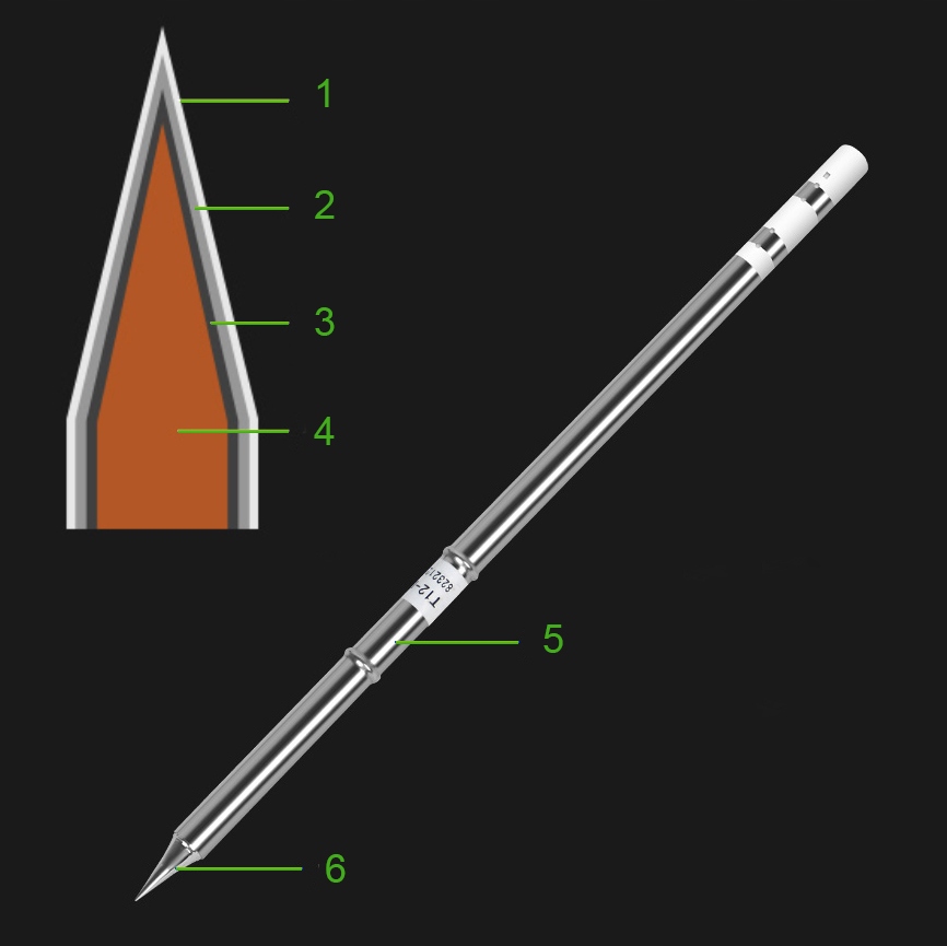 Як ви бачите на малюнку поруч, серія T-12 інтегрована з датчиком нагрівача та температури . Тож нагрівальний елемент і пайка - один елемент, який називається кінчиком. Зверніть увагу, що датчик температури (термопала) розміщується дуже близько до кінця паяльної печери, що забезпечує дуже точне вимірювання температури під час процесу паяльного процесу.