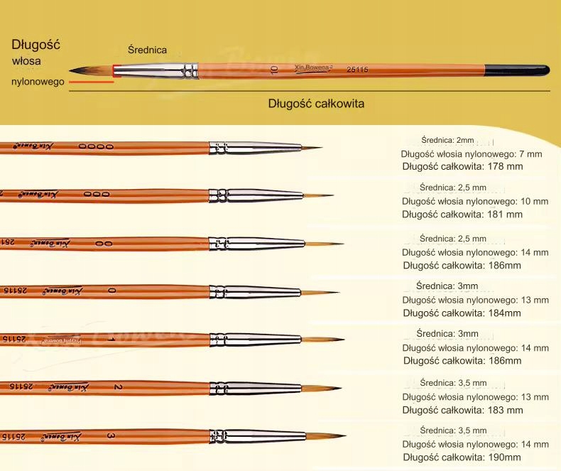 - волосся: нейлон, який є і міцним і м'яким, що дозволяє точно малювати. Розроблений для комфорту та контролю під час малювання.