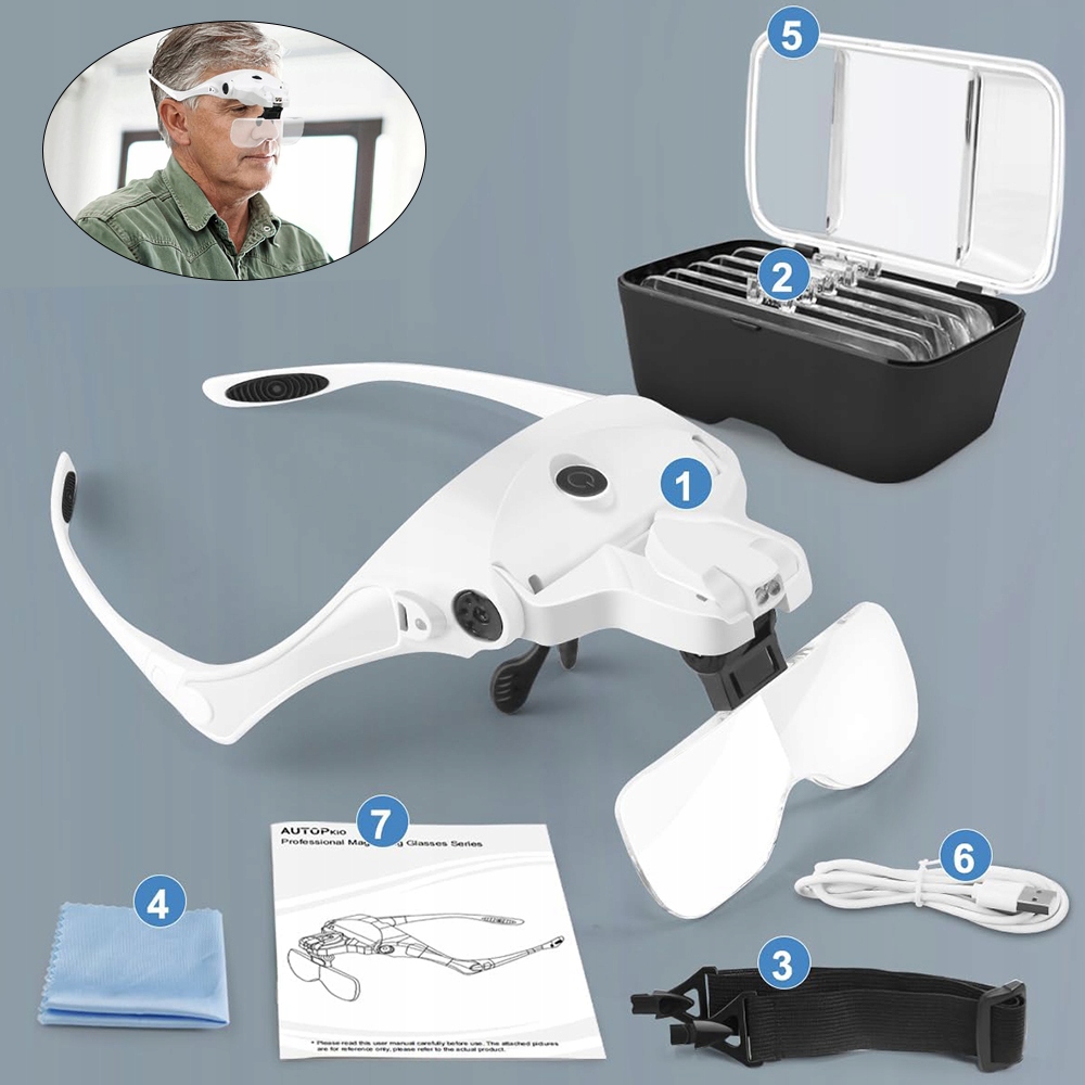 Перезаряджувана накладна лупа пропонує 5 лінз зі збільшенням 1,0x, 1,5x, 2,0x, 2,5x і 3,5x, які адаптуються до ваших потреб. Лінзи добре захищені в футлярі.