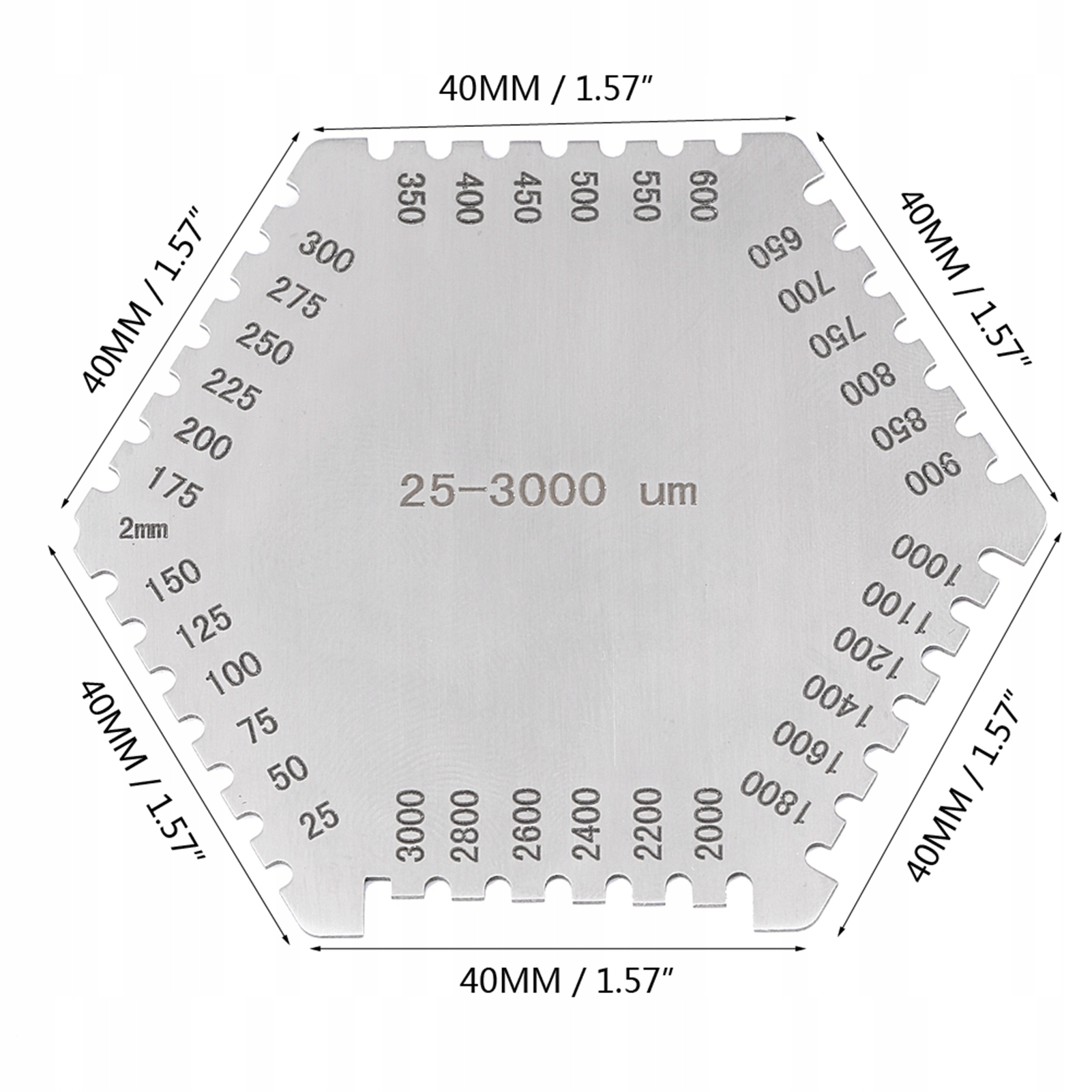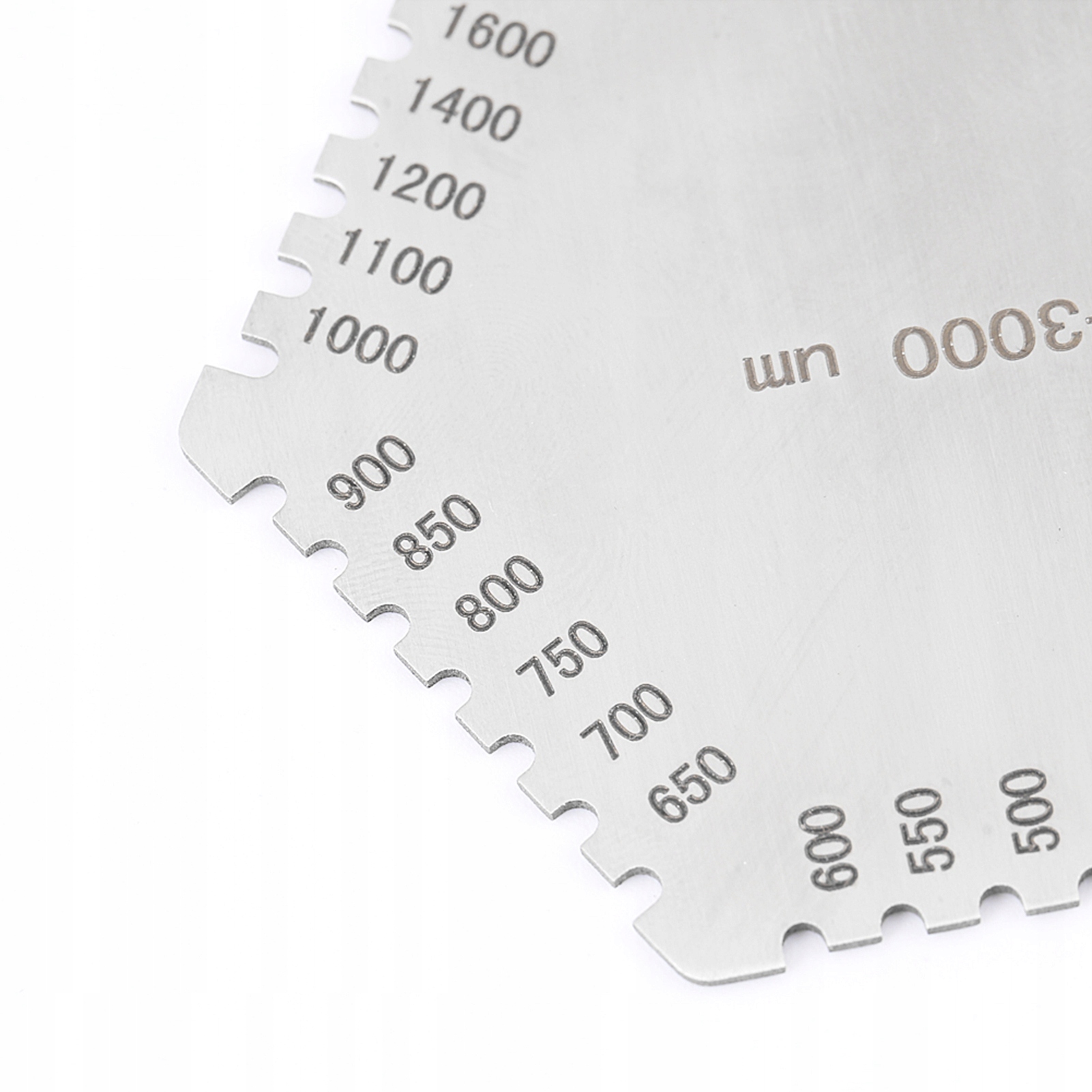 Detailed measuring range of the comb meter: 25, 50, 75, 100, 125, 150, 175, 200, 225, 275, 300, 350, 400, 450, 500, 550, 600, 650, 800, 850, 900, 1000, 1100, 1200, 1400, 1600, 1800, 2000, 2200, 2400, 2600, 2800, 3000um