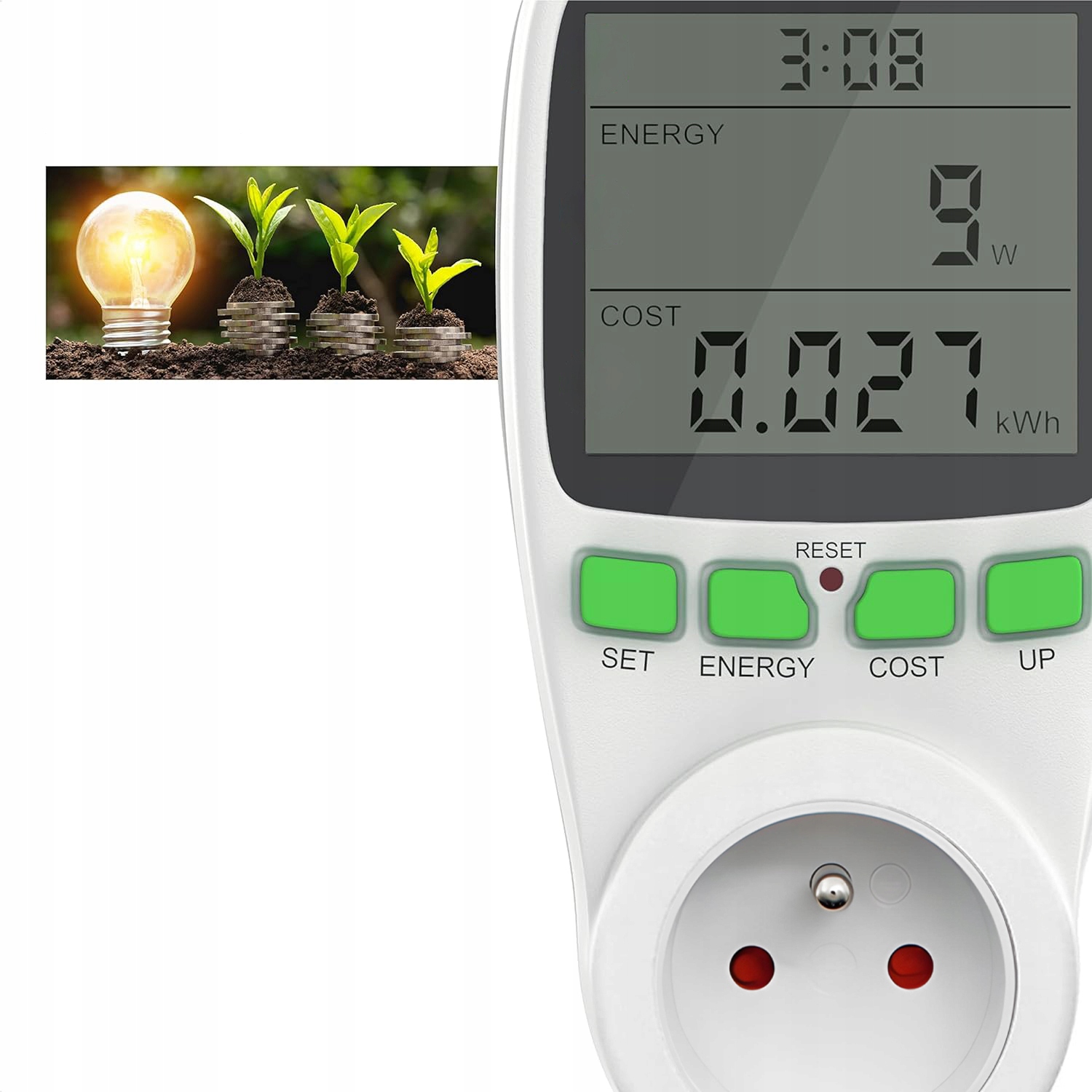 Просто вставте лічильник в розетку, встановіть тариф і підключіть прилад. Вся необхідна інформація, така як енергоспоживання, витрати, час та інші параметри чітко видно на екрані, що робить контроль енергоспоживання простим і зручним.