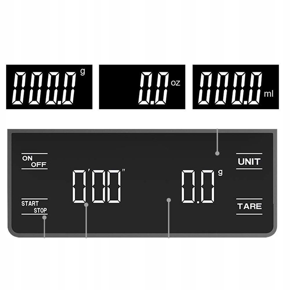 ☕ конструкції вага кави підтримує три одиниці перетворення: унція, g, мл і можуть зважувати тверді тіла, рідини та порошки. Вважний діапазон становить від 0,1 г до 3 кг.