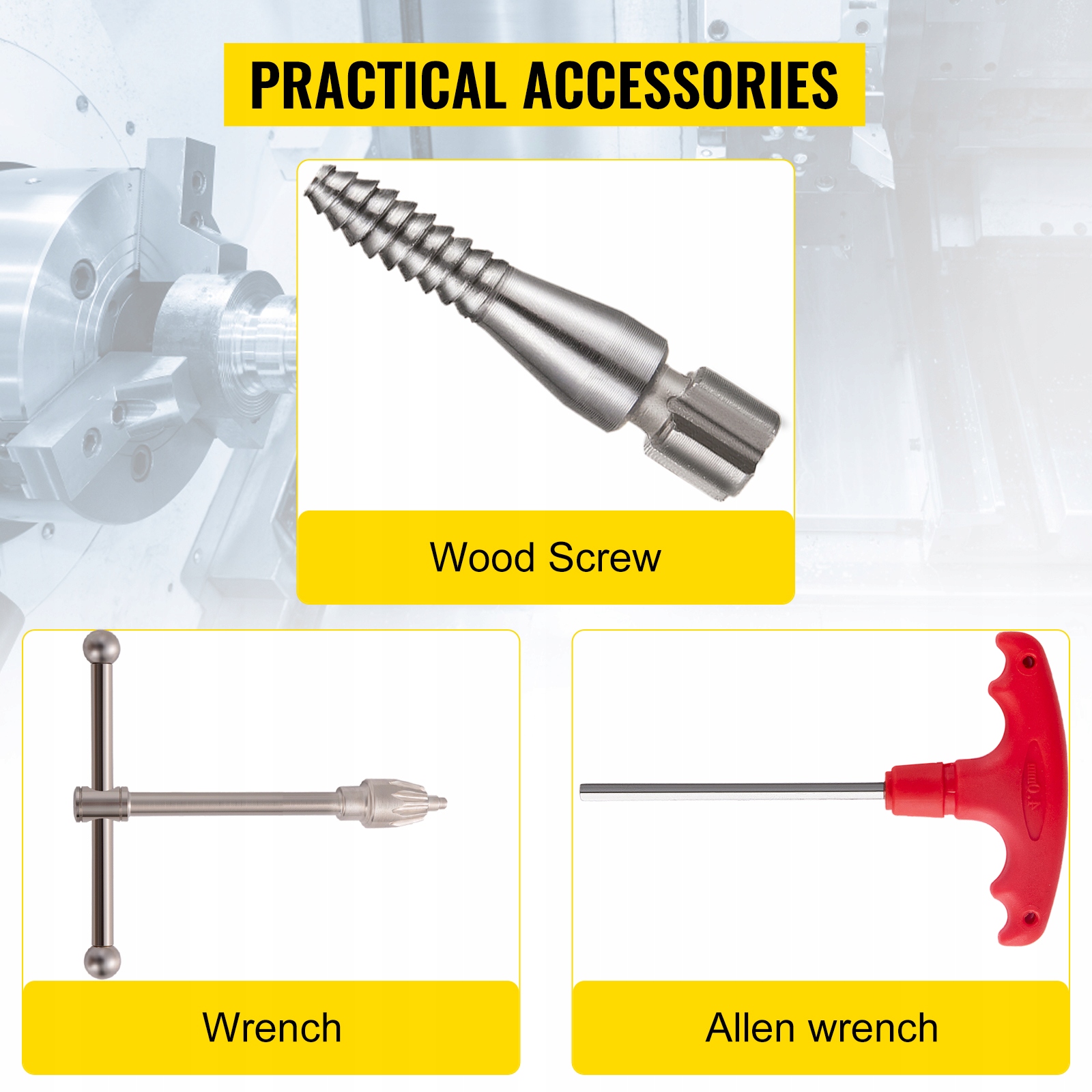 Повний набір патронів для токарних верстатів по дереву включає дерев’яний гвинт і два гайкові ключі, які значно полегшують установку та демонтаж.