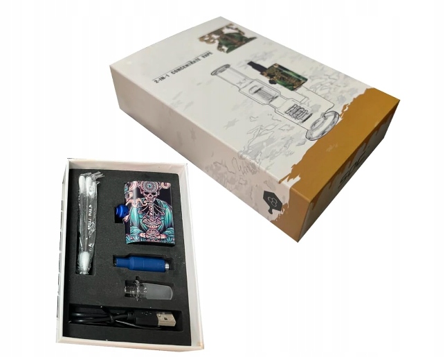 - 1. Комплект випарника. Вміст упаковки: випарник, скляний носик, запасний носик, USB-кабель для заряджання, інструмент для пірсингу, щітка для чищення та посібник (англійською мовою не гарантується).