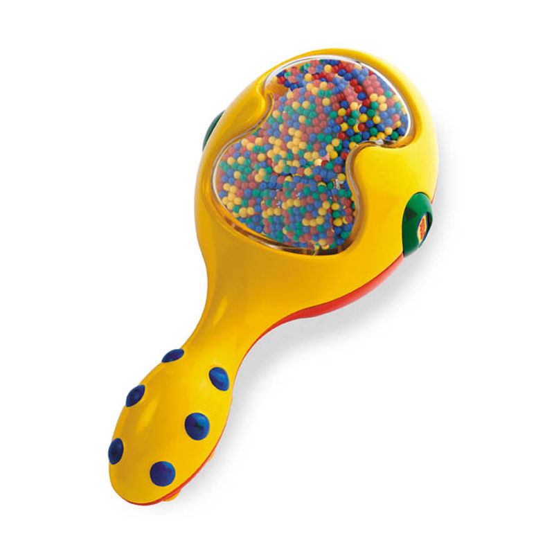 Цей жовто-червоний маракас – чудовий перший інструмент для дитини. Простий у використанні, навіть інтуїтивно зрозумілий. При струшуванні видає легке брязкання. Ідеально підходить для знайомства вашої дитини зі світом звуків і ритму. Завдяки великій ручці з м'якими гумовими виступами вашій дитині буде дуже зручно тримати її і навіть використовувати як прорізувач під час прорізування зубів.Спочатку дайте дитині поглянути на іграшку і поспостерігати за її реакцією. Чи може дитина вгадати, як видавати звук з маракасів? Якщо ні, поясніть, що робити, але не показуючи дії самостійно, ви побачите, чи зрозуміє ваша дитина словесну інструкцію. Якщо йому це вдається, похваліть його і підкажіть, як створити правильний ритм маракасами. Можна поплескати або показати, як це робиться, використовуючи іграшку. Далі неодмінно буде вибух творчості дитини при створенні нових звуків. Заохочуйте дитину експериментувати зі звуками. Вивчайте разом із дитиною нові ритми, щоб розвивати її музичні навички.