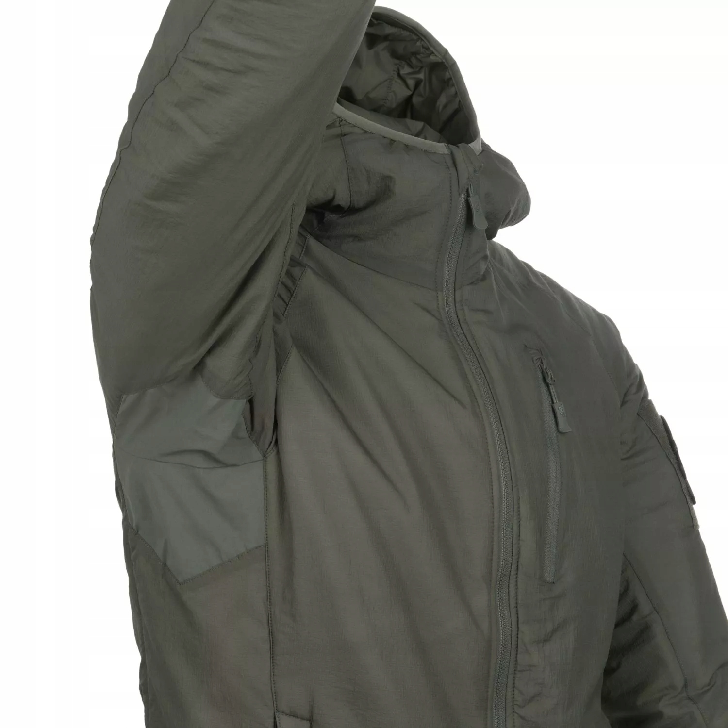 Helikon Wolfhound Hoodie - це легка куртка з капюшоном, яку можна використовувати як самостійний утеплюючий шар або як ізоляційний шар у поєднанні з софтшеллом або хардшеллом. Утеплювач Climashield Apex, який використовується в куртці, зігріває користувача в будь-яких умовах. Якщо він намокне, він швидко висихає.