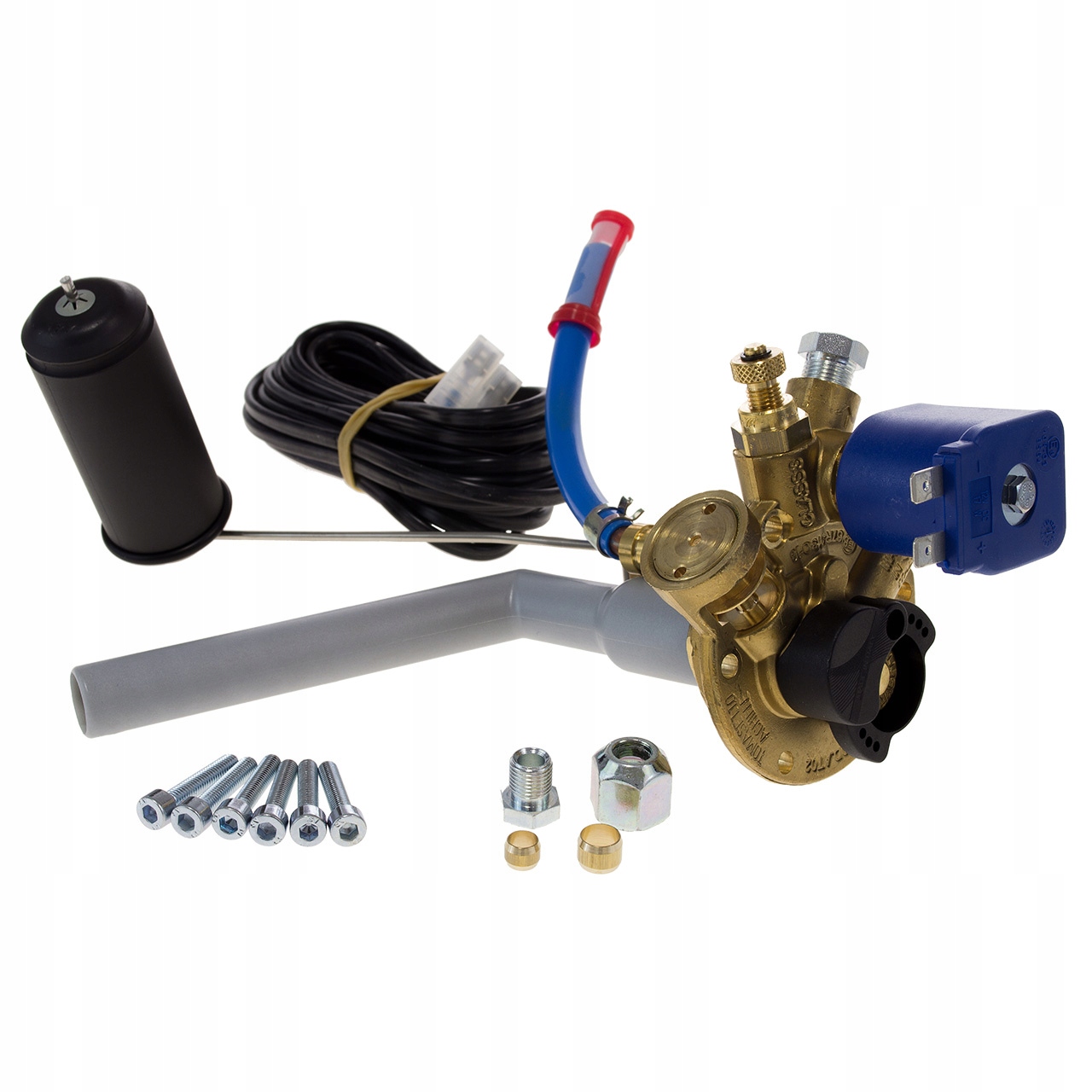 Мультиклапан Tomasetto EXTRA для тороїдальних внутрішніх баків, встановлений замість запаски, висотою 250 мм. Нахил отвору - 30 градусів. Без заправного клапана.