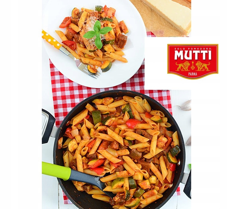 Розігрійте духовку до 220 градусів. Баклажани, цукіні та перець наріжте (звичайно, спочатку вимийте та обсушіть) кубиками приблизно 1 та 1/2 см - шматочки не повинні бути дуже дрібними :) Очищену цибулю наріжте шматочками такого ж розміру. Велике деко збризніть столовою ложкою олії, викладіть туди овочі, між ними покладіть неочищені зубчики часнику, збризніть іншою столовою ложкою олії і злегка посипте сіллю. Поставити в гарячу духовку і випікати 20 хвилин. Вийміть з духовки і відставте на 5 хвилин, щоб рідина випарувалася. Перемішайте овочі і знову поставте в гарячу духовку на 20 хвилин. Обсмажений часник очистіть від шкірки і дрібно наріжте. Розігрійте столову ложку олії у великій сковороді та додайте томатний соус Mutti Basilico. Додайте запечені овочі, залийте приблизно 1 склянкою води (рівно стільки, щоб вийшов густий соус), додайте базилік, орегано і чебрець. Приправити сіллю і перцем. Варіть на середньому вогні, постійно помішуючи, 2-3 хвилини - поки соус не загусне, а овочі не залишаться твердими.