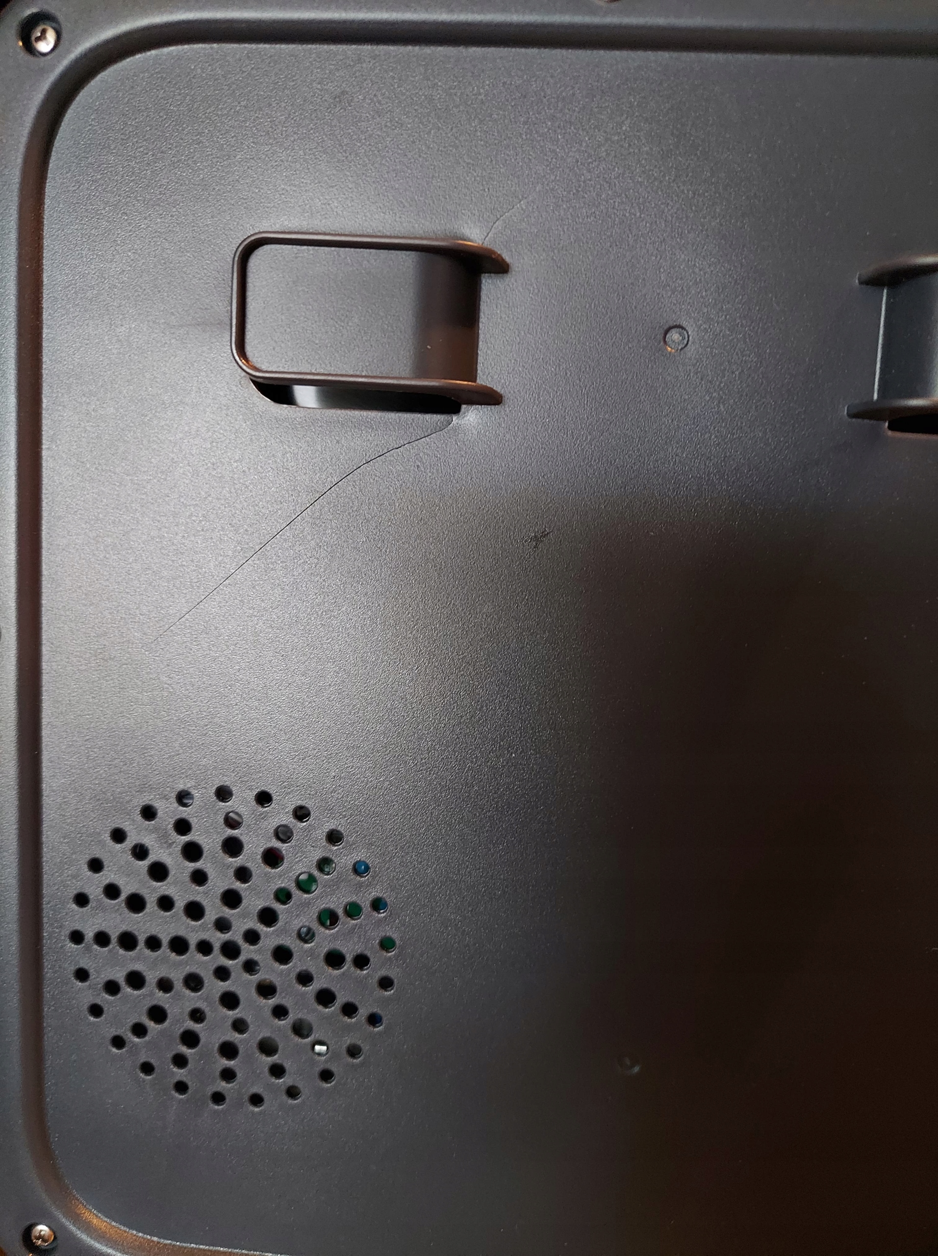 Є мінімальна тріщина на пластику в одному місці на задній частині корпусу, видно на останньому фото, не заважає використанню.