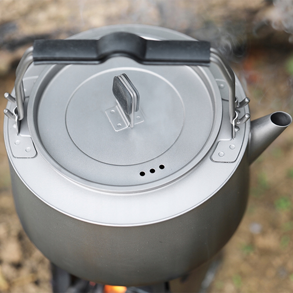 - Цей чайник виготовлено з титанового матеріалу, легкого, стійкого до корозії та здорового. Він чудово підходить для кемпінгу, походів, подорожей і домашнього використання.