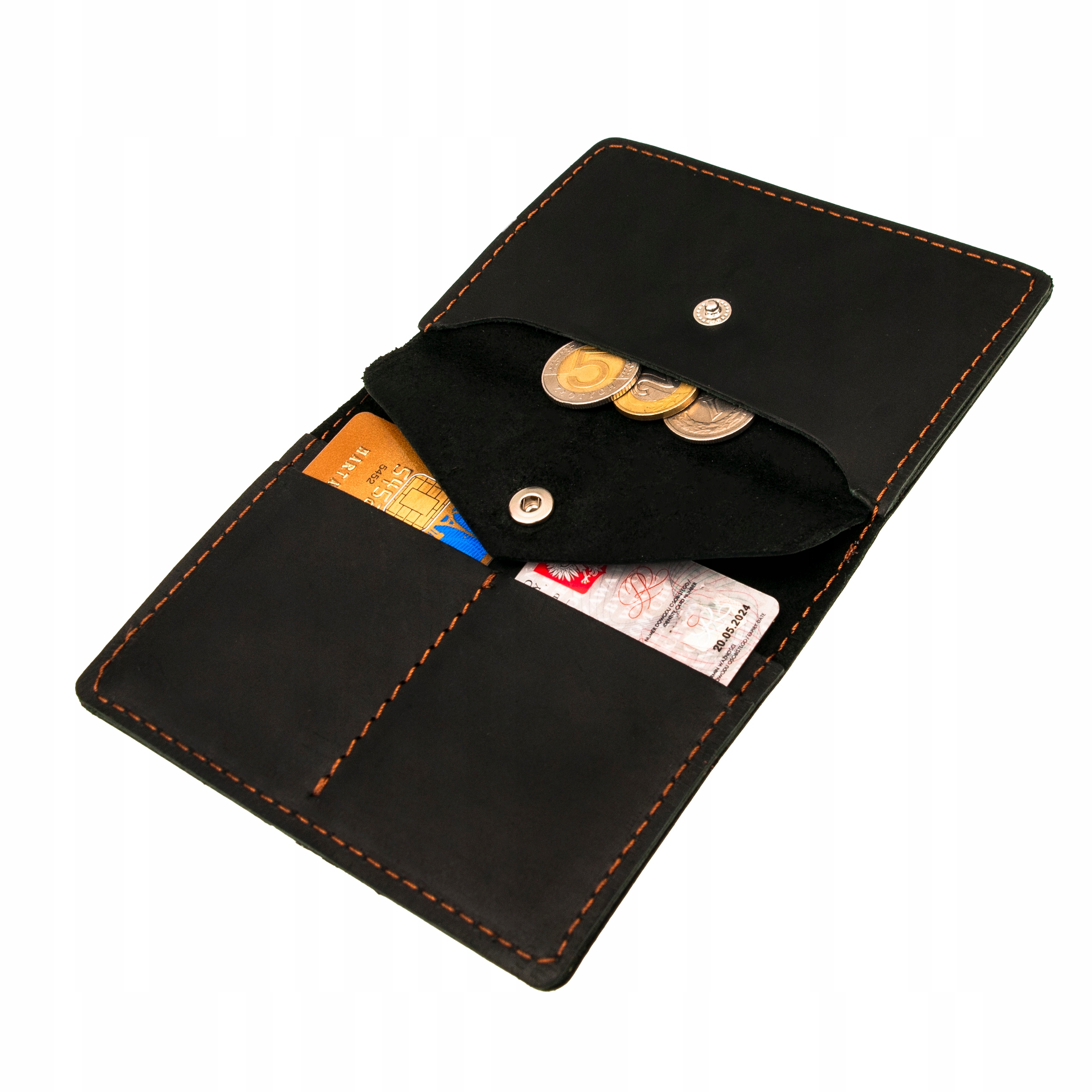 Всередині гаманця є кишеня для монет. Він має застібку, яка захищає монети від випадання.
