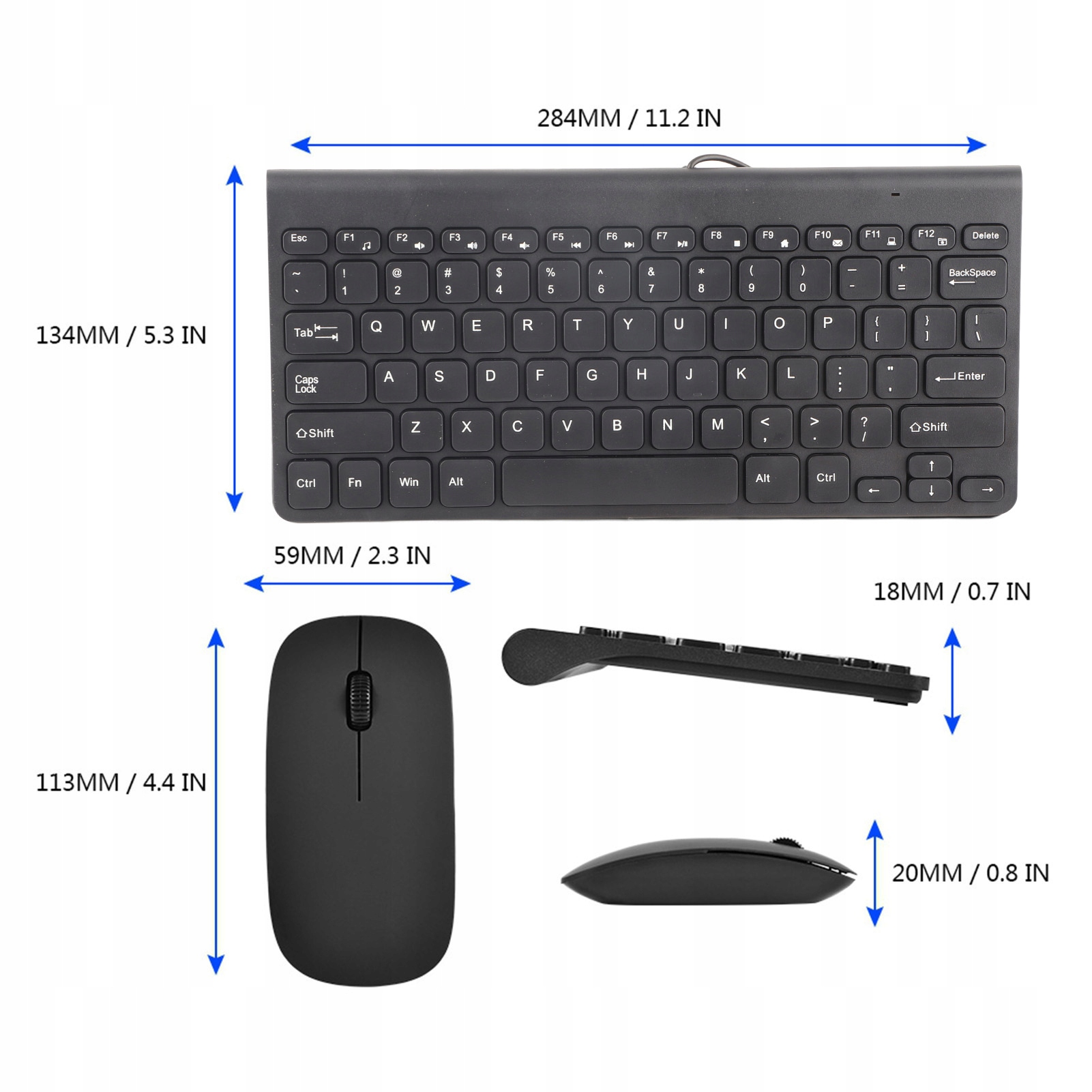 Це міні-дротова клавіатура та миша. Розмір клавіатури: 284*134*18 мм. Розмір мишки: 113*59*20 мм.