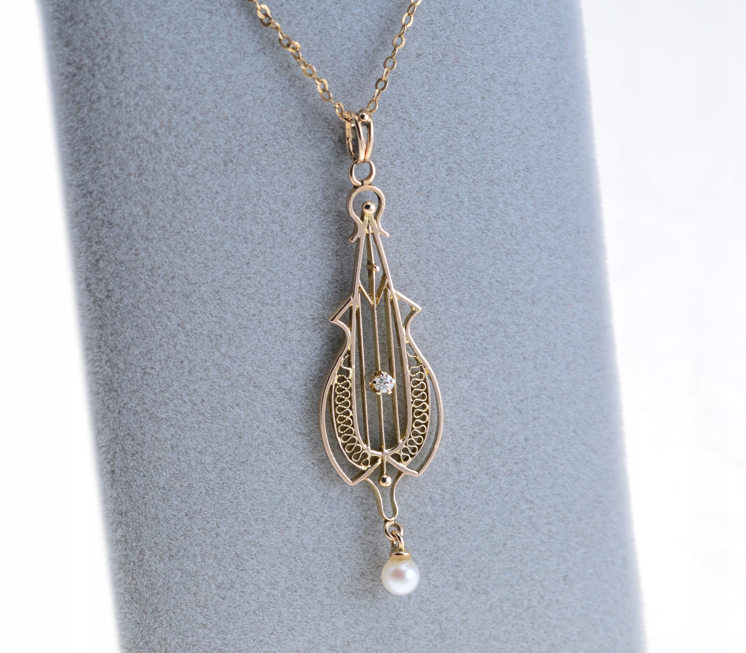 golden golden per golden pment per golden per ancenden per ancenden per ancenden pment per ancenden pment pment pment pment pment pment pment pment pment pment pment pment pment pment pment pment pment pment pment pment pment pment pment pment pment pment pment per per. З відкритою роботою, поздовжньою формою, прикрашеним єдиним, маленьким діамантом у центральній частині і висіли внизу круглою перлиною. Підвіска в комплекті з золотим ланцюгом 47 см.