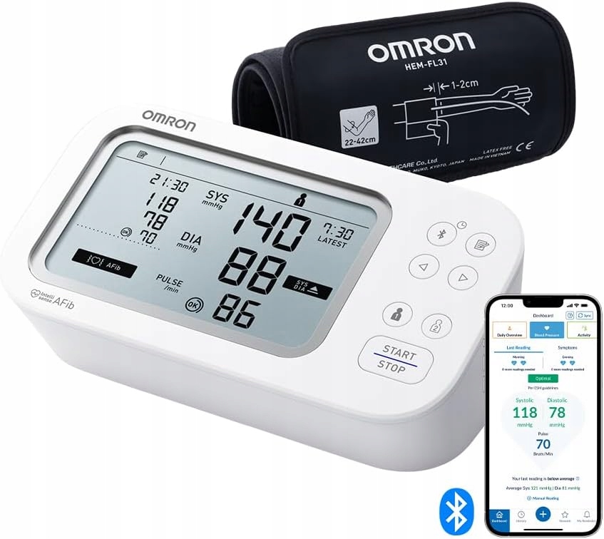 Тонометр OMRON X7 — це перевірений і повністю клінічно перевірений пристрій. Він точно вимірює артеріальний тиск і, що важливо, також виявляє фібриляцію передсердь. Пристрій автоматично передає результати вимірювань на смартфон через Bluetooth.