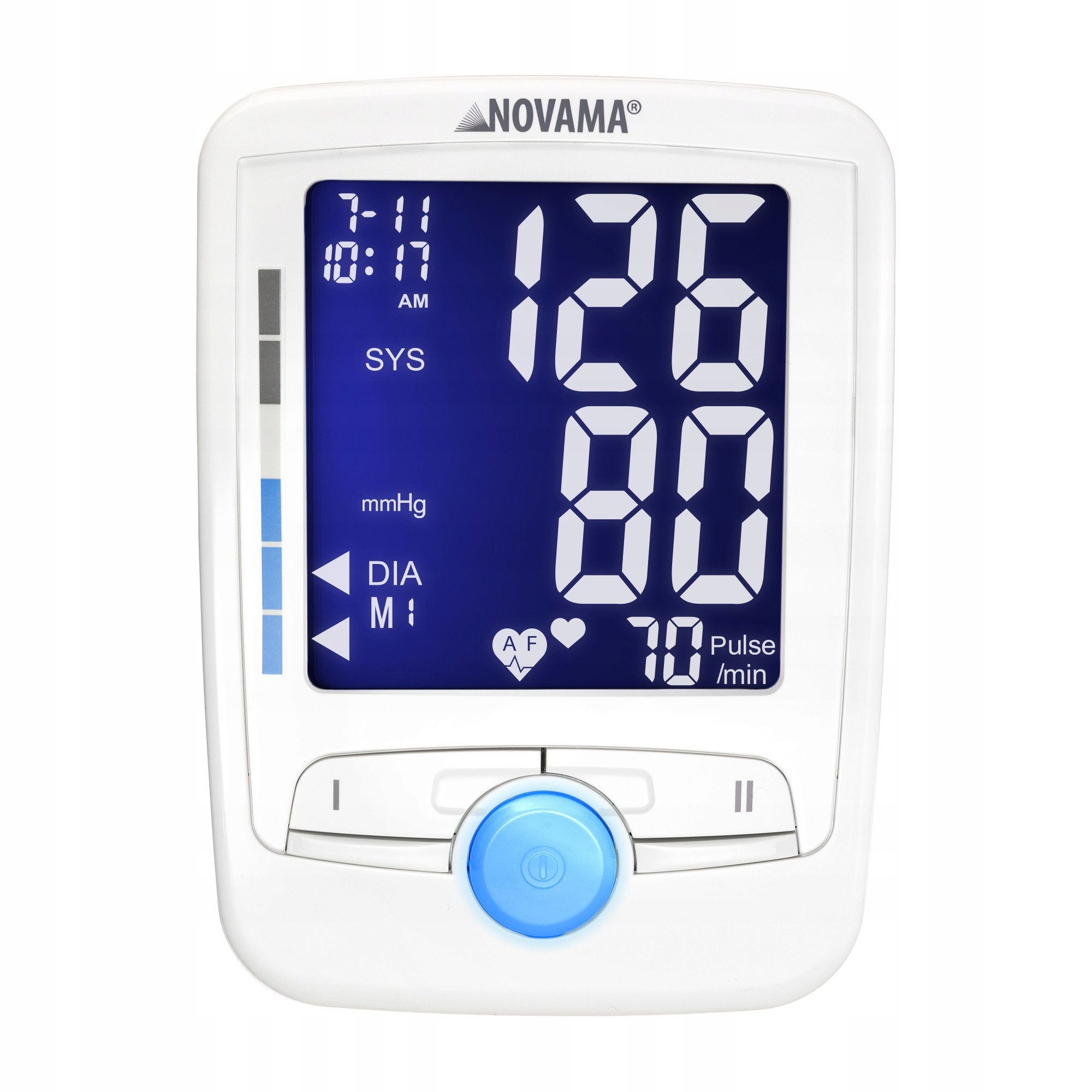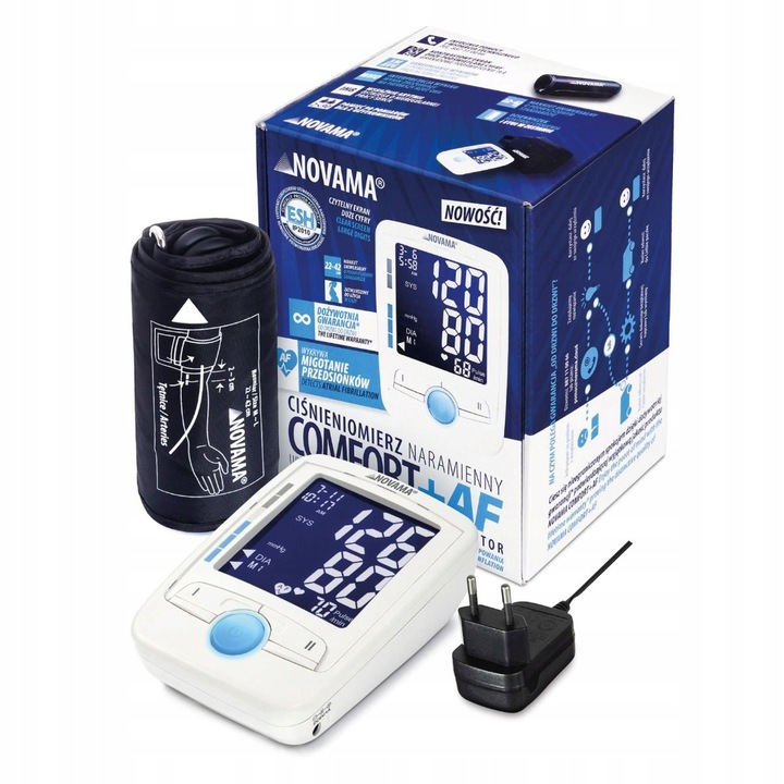 Тонометр Novama COMFORT+AF є найсучаснішим тонометром від Novama. На додаток до виявлення аритмії (IHB), прилад оснащенийдетектором фібриляції передсердь (AF). Novama Comofort+ AF - медичний прилад, оснащений сучасною технологією вимірювання під час надування. Це робить вимірювання більш делікатним і швидшим. Він має дуже великий, чіткий, контрастний РК-дисплей з підсвічуванням і пам'яттю останніх 90 вимірювань для 2 користувачів. Пристрій також пройшов клінічну перевірку для використання під час вагітності, що доводить його високу точність і безпеку.