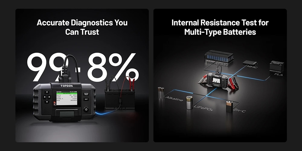 TOPDON BT600 Plus — це вдосконалений тестер акумулятора та системи запуску/заряджання, ідеально підходить для використання в автомобілях і вантажівках, мотоциклах, човнах або фургонах. У порівнянні зі звичайними тестерами, він оснащений власною батареєю ємністю 5200 мАг, завдяки чому дає можливість повністю автономної роботи без необхідності підключення до живлення від акумулятора - тестування можливе навіть у випадках, коли акумулятор сильно розряджений (від 2 В).